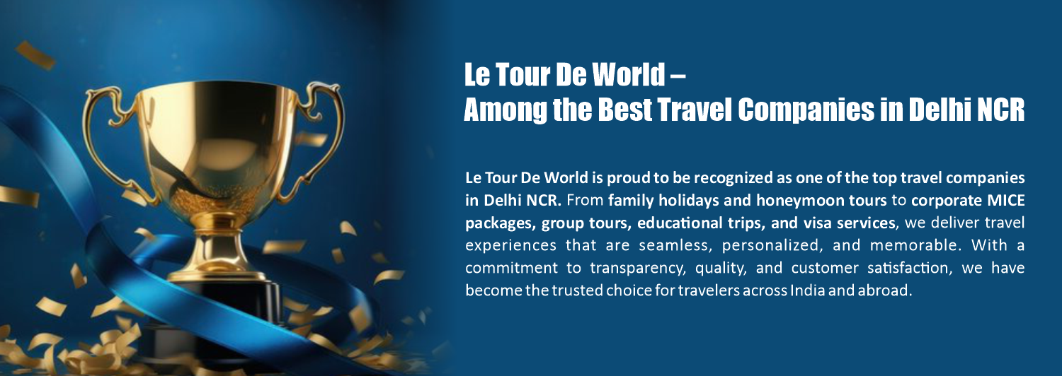 Le Tour De World is proud to be recognized as one of the top travel companies in Delhi NCR. From family holidays and honeymoon tours to corporate MICE packages, group tours, educational trips, and visa services, we deliver travel experiences that are seamless, personalized, and memorable. With a commitment to transparency, quality, and customer satisfaction, we have become the trusted choice for travelers across India and abroad.
